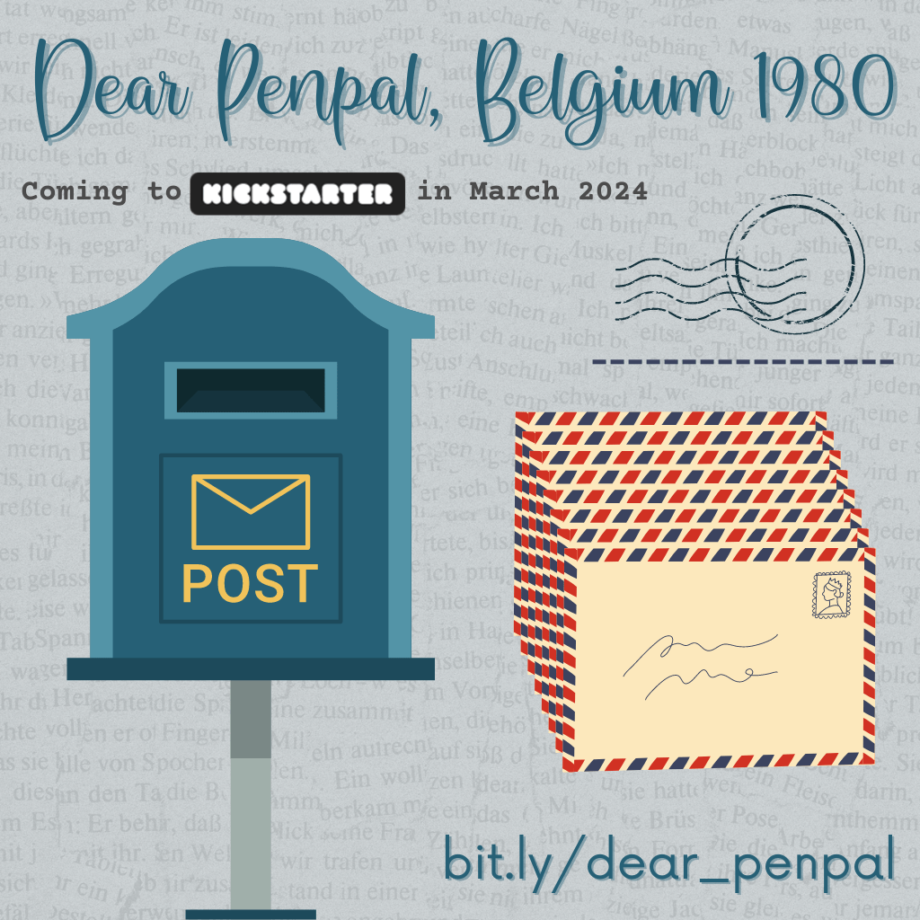 Kickstarter BackerKit: I am launching a Kickstarter for in late March 2024 called “Dear Penpal, Belgium 1980.” It is a cozy, Middle Grade appropriate, ghost story, loosely based on fictionalized me at ten years old while living in a 300-year-old manor house in Belgium. Won’t you be my penpal?