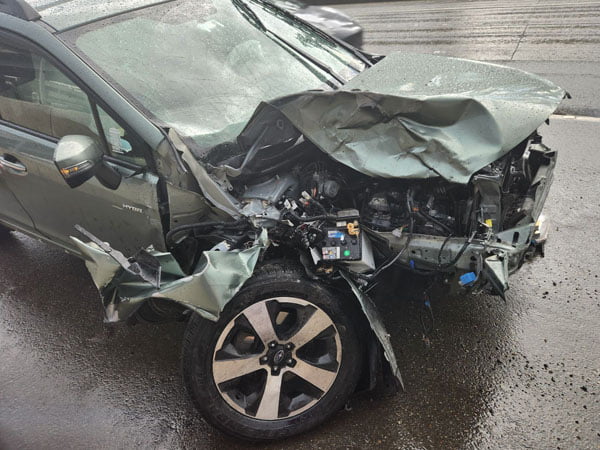 However, as this is my home convention, the Husband likes to drive home to take care of the kitties at night. Wednesday evening of the convention (set up day), I received this text: “First, I am ok. Second, I wrecked the car.” There was a lot more to that conversation, but it didn’t get any worse than that. However, that was enough. The Husband is shaken and bruised (contusions and not a hematoma) and the bruises are extensive. Yes, he has gone to the hospital. He sent me “proof of life” of his face before he sent me pictures of the car. One of them is below.
