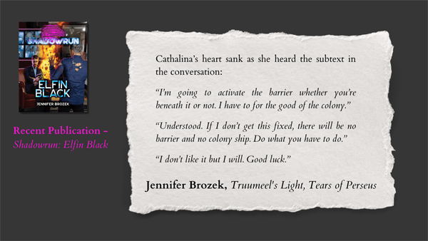 Jennifer has been a full-time freelance author and editor for over seventeen years, and she has never been happier. She keeps a tight schedule on her writing and editing projects and somehow manages to find time to teach writing classes and volunteer for several professional writing organizations such as SFWA, HWA, and IAMTW. She shares her husband, Jeff, with several cats and often uses him as a sounding board for her story ideas. Visit Jennifer’s worlds at jenniferbrozek.com or her social media accounts on LinkTree.